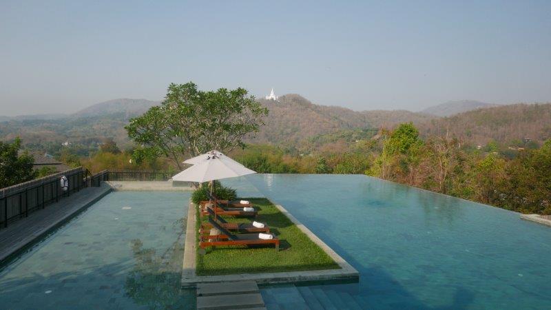 放下行李後,我馬上拉卡拉往泳池走去,反正距離靜坐課還有幾個小時。位於度假村的最頂點,這個曾被泰國房產雜誌選為十大旅館泳池的無邊際泳池,風涼景佳,美得不可思議,俯瞰連綿山林,依稀可辨認出山上的梯田和寺廟。